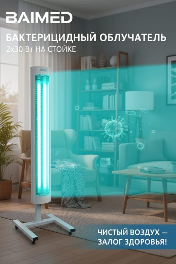 Бактерицидный облучатель «BAIMED» с двумя лампами по 30 Ватт каждая – это открытый тип устройства с озоном, установленным на передвижной стойке с колесиками. Данный облучатель предназначен для эффективного обеззараживания воздуха и поверхностей в помещениях площадью до 60 квадратных метров.